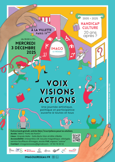 Voix, visions et actions – handicap et culture, 20 ans après, à La Villette. « Imago-Le Réseau vous donne rendez-vous pour une journée artistique, politique et participative, ouverte à toutes et à tous, pour faire le bilan, imaginer l’avenir et agir ensemble. Parce que rien ne se fait sans les premiers concernés, la journée rassemblera des artistes en situation de handicap et proposera divers services et outils d’accessibilité pour permettre à tous les publics d’accéder et de profiter pleinement de la journée. » Lieux : Grande Halle – Salle Boris Vian et Little Villette, 211 avenue Jean Jaurès à Paris (19e). Le matin, grande table-ronde animée et composée exclusivement de personnes concernées pour prendre de la hauteur sur les notions d’accessibilité, d’inclusion et de représentation du handicap, en interrogeant notre vocabulaire, nos pratiques et nos cadres de pensée. Des restitutions artistiques à partir de témoignages de personnes concernées par une situation de handicap. L’après-midi, ateliers de pratiques artistiques menés par des artistes en situation de handicap. Un village associatif valorisant les initiatives, services et outils en faveur de l’accessibilité culturelle. Événement gratuit / inscription obligatoire pour les ateliers. Contact : imagolereseau@gmail.com ou 07 63 78 36 52.